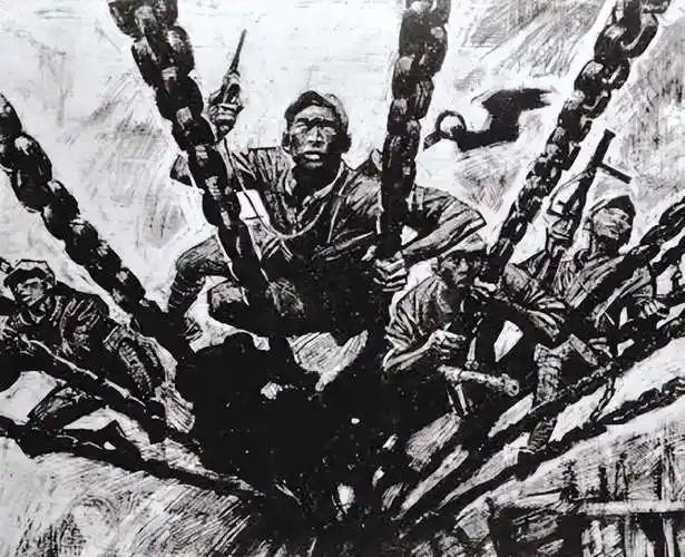 突击队的22名强者开端站了出来,他们带着短枪、手榴弹,腰上缠着皮带,冒着敌东说念主的炮火,合手着冰冷的铁索一步步往前冲。莫得木板,就踩着光溜溜的铁索前进;枪弹嗖嗖飞过,身边的战友连续中弹坠入河中,可剩下的东说念主莫得停驻脚步,依旧极力上前。
