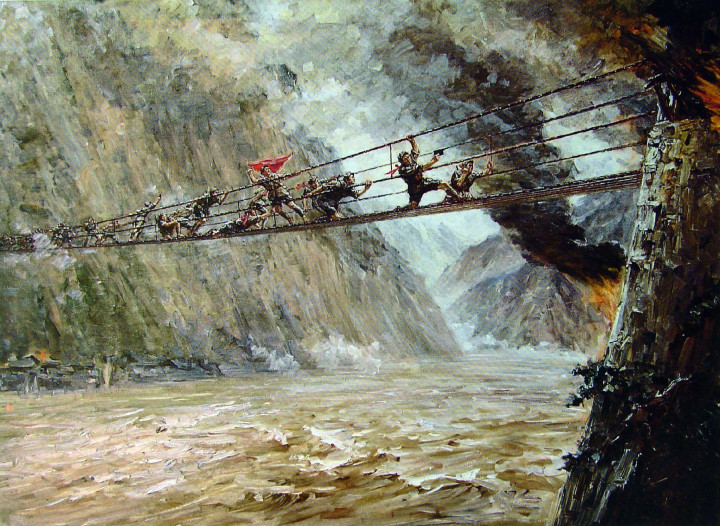 枪声、高歌声、河水的怒吼声交汇在一说念,泸定桥成了一派火海与战场。强者们顶着炮火冲过铁索,纵身跃入敌阵,与敌东说念观点开决死搏斗,后续队列紧跟而上,一举拿下了泸定桥,奏效为赤军绽放了前进通说念,透顶离散了蒋介石的围堵贪念。
